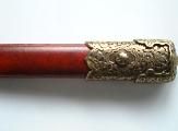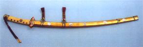 近代の細太刀(大正時代・個人蔵・全長85.5cm) 細太刀は飾太刀の飾金物を省略したものが本来でしたが、近代では陣太刀風の湾曲のある刀になっています。 この細太刀は戦前の勅任官が儀式の際に使用したもので、鞘は沃懸(いかけ)地という目の細かい金粉を使ったもの。これは平安時代は検非違使や老人用でした。 |